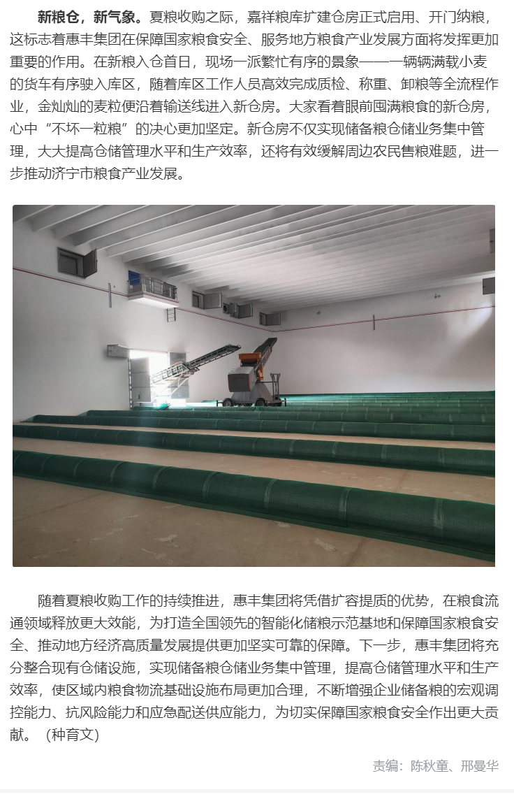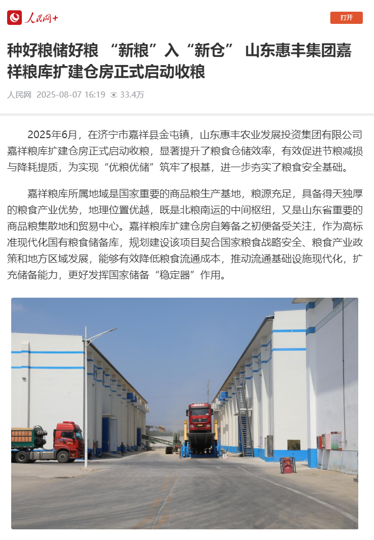 《人民网》| 种好粮储好粮 “新粮”入“新仓” 山东惠丰集团嘉祥粮库扩建仓房正式启动收粮